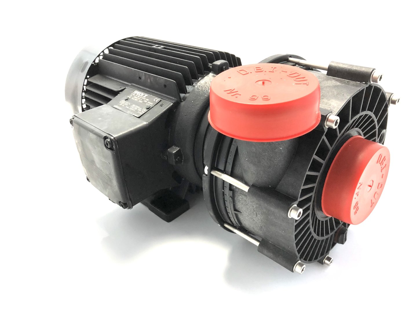 Normalsaugende Umwälzpumpe BADU 21-80/32 G-AK-SSV, Dr., Drehstrom, in Laternenausführung für Schwimmbad- und Industrie-Filteranlagen, Gegenstrom- Schwimmanlagen, Klimaanlagen, Schwimmbad-Attraktionen, Reinigungsgeräte u.a.m., bis 90 m³/h Förderstrom. Gleitringdichtung SIC/SIC + VITON 3~ Y/Δ 400/230 V H max. = 12,5 m Q max. = 75 m³/h techQ: 40 m³/h techH: 12 m WS Motorleistung: 2.60 kW Saug/Druck(G): 2 3/4" AG / 2 3/4" AG Beschreibung: Die Kunststoffpumpen der Baureihe BADU 21-80/32 G-AK-SSV, Dr in Drehstromausführung sind zur Förderung von Flüssigkeiten in Kombination mit weiteren Anlagenteilen konzipiert. Die Motorwelle dient gleichzeitig als Pumpenwelle, auf der das Laufrad befestigt ist. Als Wellendichtung dient eine Balg-Gleitringdichtung, die auf einer Laufradnabe aus Kunststoff sitzt. Hierdurch ist eine sichere Trennung zwischen Schwimmbadwasser und Elektromotor gegeben. Diese Nabe dient als Wellenschutzhülse. Durch die Blockbauweise haben die Pumpen einen geringen Platzbedarf. Sie werden durch Drehstrommotoren angetrieben. Einsatzgebiet: Thermalwässer, Thermalsole, Seewasseraquarien mit künstlich aufbereitetem Salzwasser, Pökelanlagen, und diverse Problemmedien nach Überprüfung der Bestandteile und Konzentration. Grundsätzlich ist bei Bestellung immer das Medium genau anzugeben, damit die Beständigkeit der Pumpen geprüft werden kann. Ausführung: Die Pumpe entspricht der Standardvariante, jedoch ist durch eine Zwischenlaterne der Dichtungsraum nicht direkt am A-seitigen Motorlager angebaut, sondern zusätzlich mit einem Zwischenraum und einer Labyrinthscheibe vom Motor getrennt. Eventuell austretendes Medium und auskristallisierende Mineralien oder Salze kommen somit nicht mit dem Motor und dem Lager in Verbindung. Hierdurch wird eine erheblich längere Betriebszeit gegenüber Standardpumpen für diese Einsatzgebiete gewährleistet.