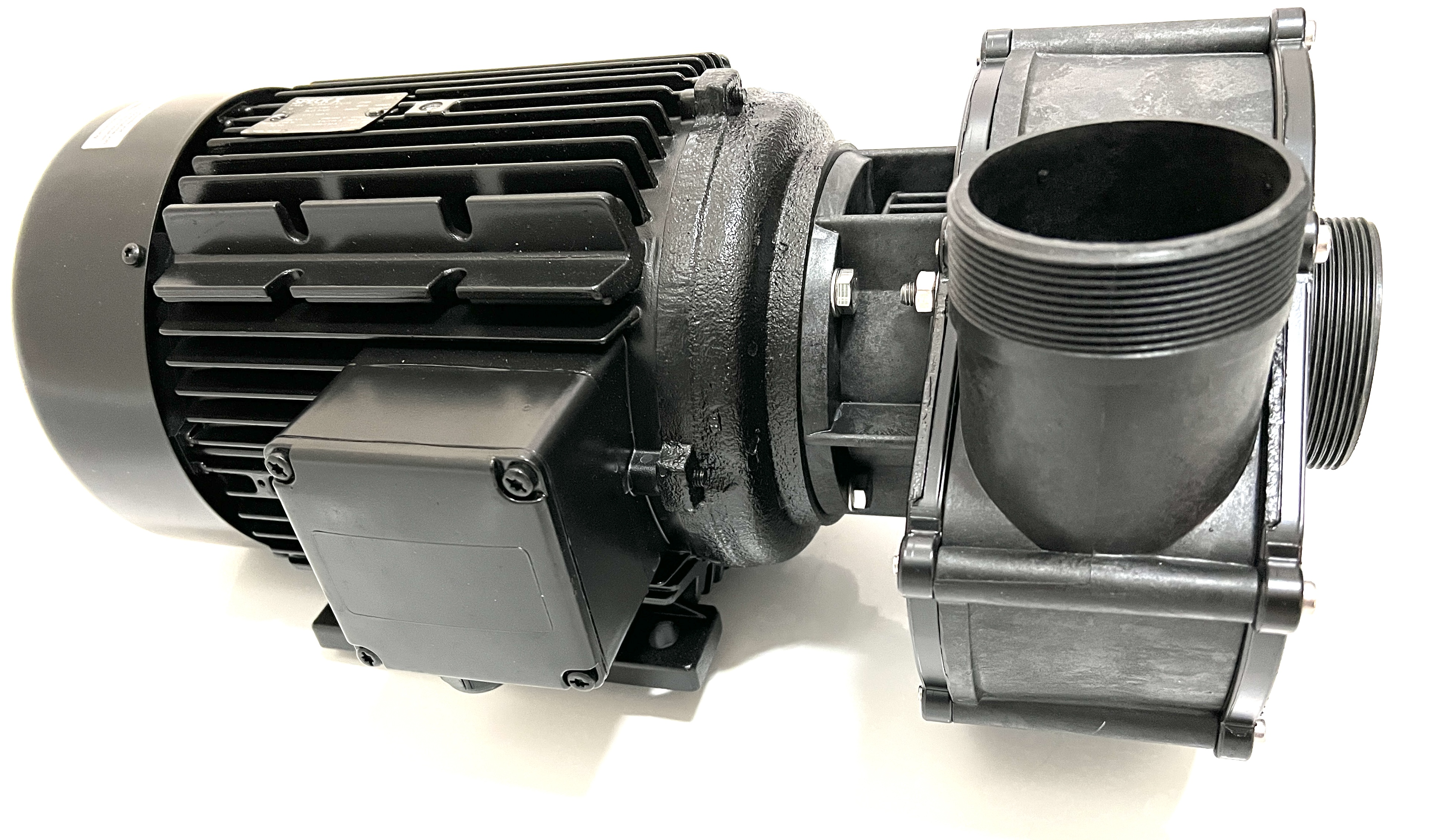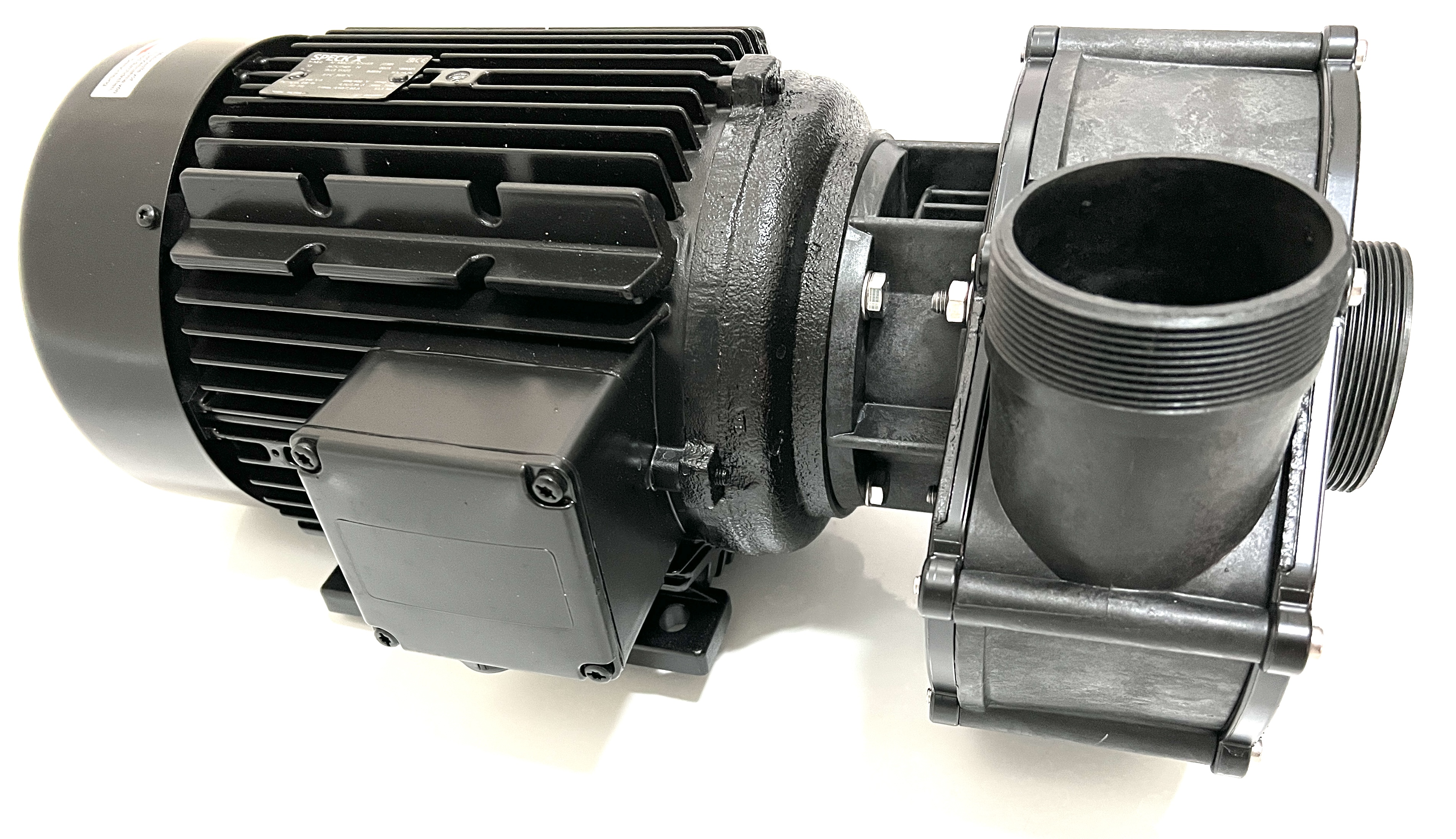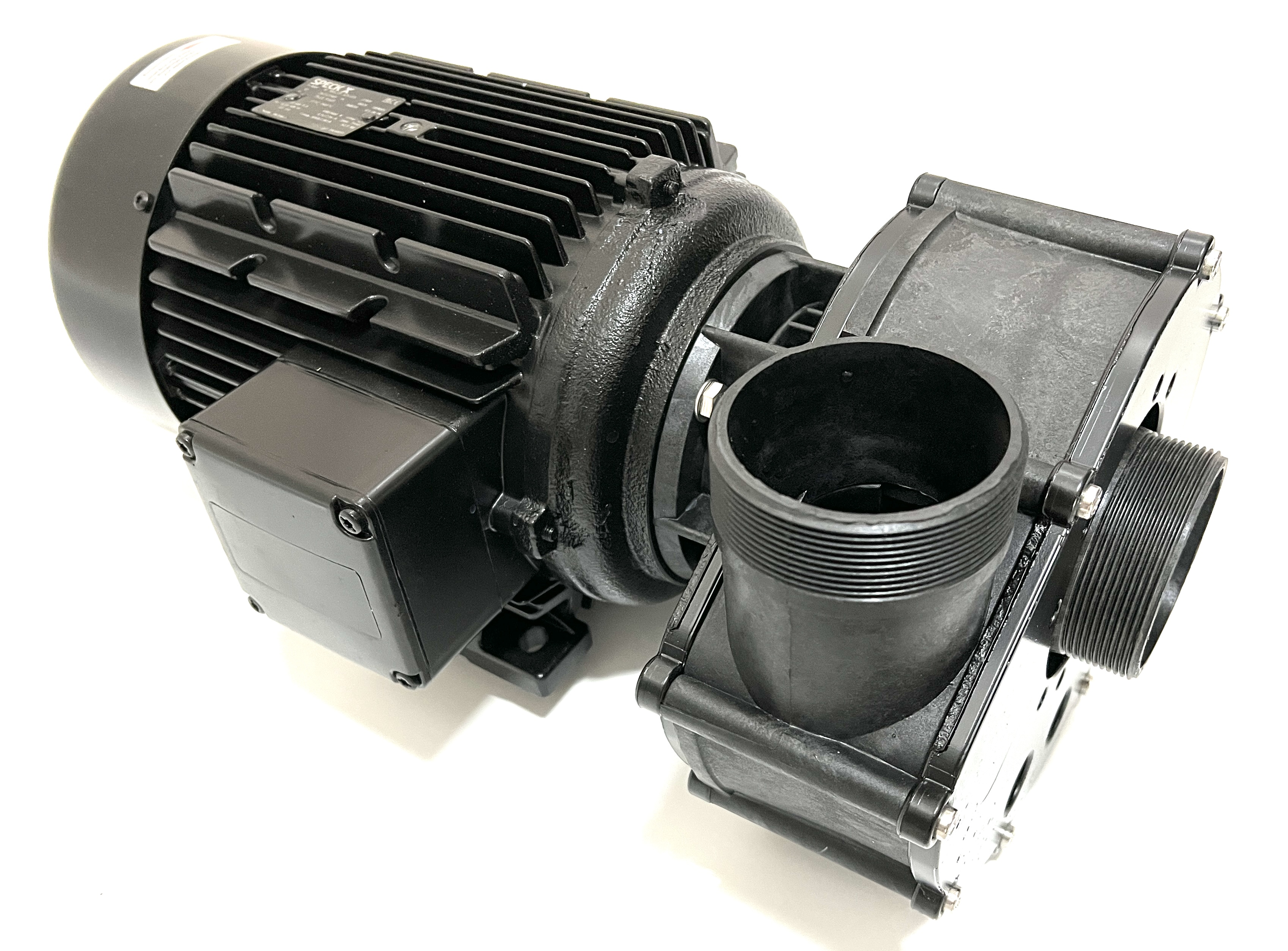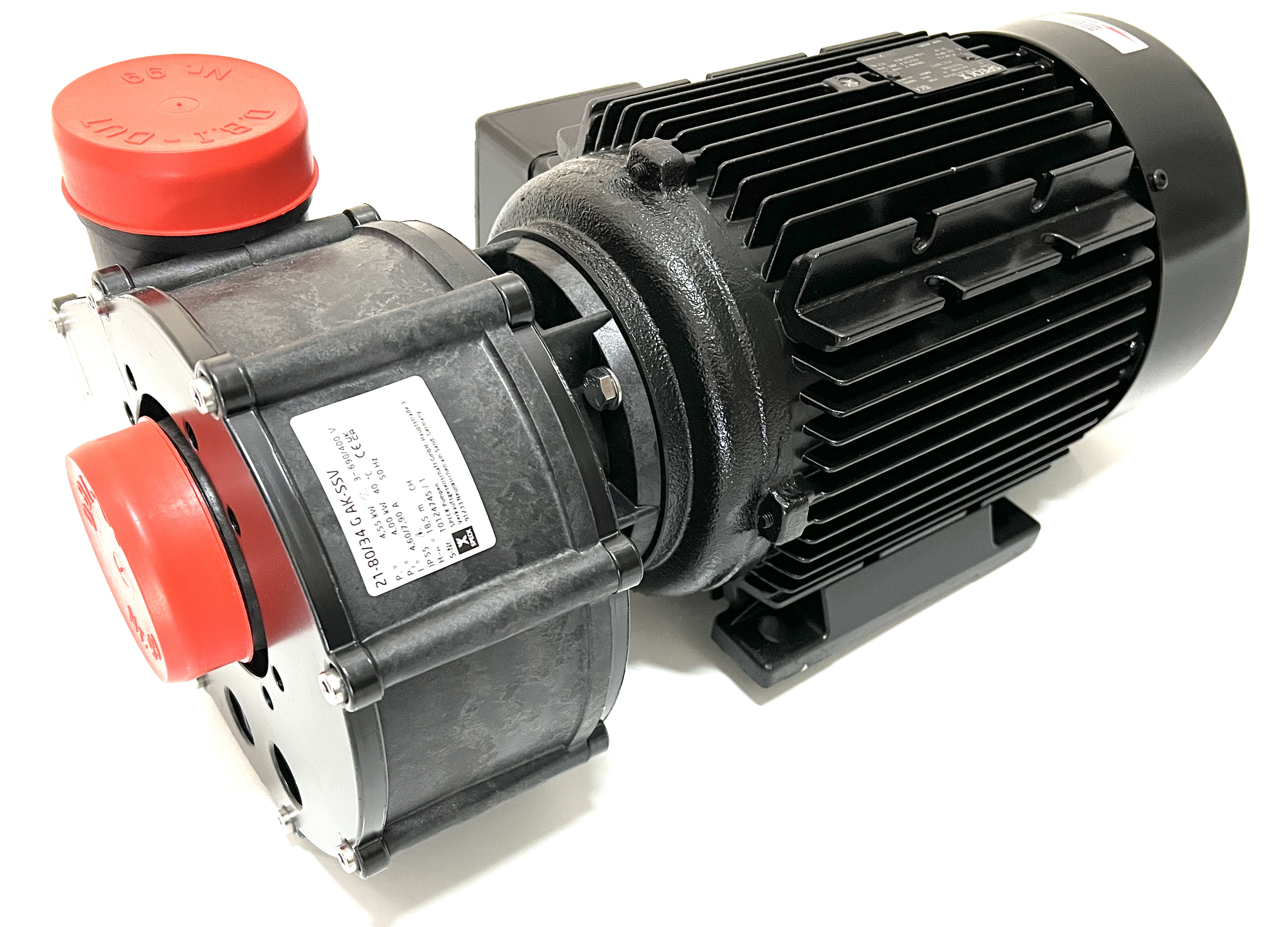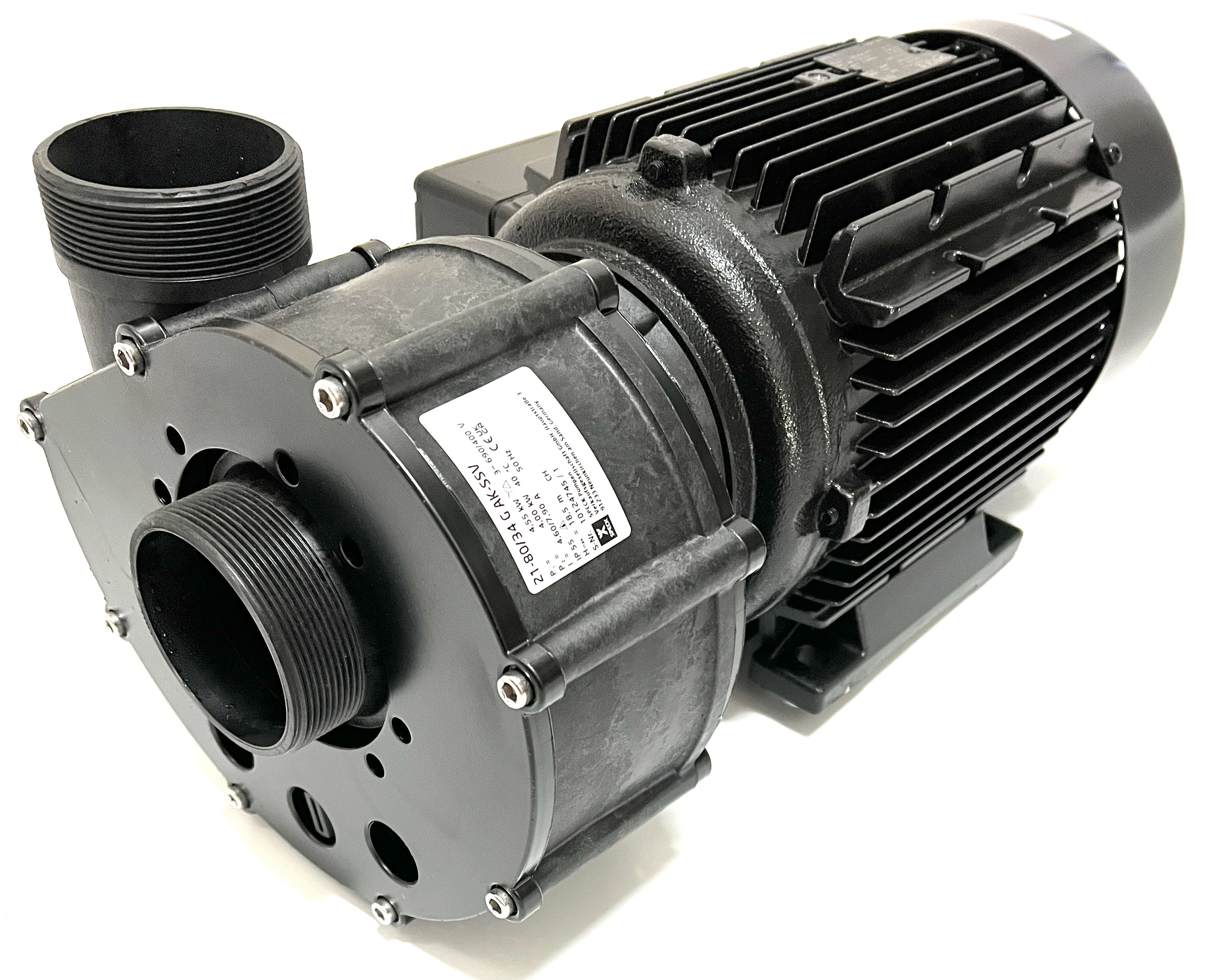 Normalsaugende Umwälzpumpe BADU 21-80/33 G-AK-SSV, We., Wechselstrom, in Laternenausführung für Schwimmbad- und Industrie-Filteranlagen, Gegenstrom- Schwimmanlagen, Klimaanlagen, Schwimmbad-Attraktionen, Reinigungsgeräte u.a.m., bis 90 m³/h Förderstrom. Gleitringdichtung SIC/SIC + VITON 1~230 V H max. = 13,8 m Q max. = 80 m³/h techQ: 75 m³/h techH: 10 m WS Motorleistung: 3.00 kW Saug/Druck(G): 2 3/4" AG / 2 3/4" AG Beschreibung: Die Kunststoffpumpen der Baureihe BADU 21-80/33 G-AK-SSV, We. in Wechselstromausführung sind zur Förderung von Flüssigkeiten in Kombination mit weiteren Anlagenteilen konzipiert. Die Motorwelle dient gleichzeitig als Pumpenwelle, auf der das Laufrad befestigt ist. Als Wellendichtung dient eine Balg-Gleitringdichtung, die auf einer Laufradnabe aus Kunststoff sitzt. Hierdurch ist eine sichere Trennung zwischen Schwimmbadwasser und Elektromotor gegeben. Diese Nabe dient als Wellenschutzhülse. Durch die Blockbauweise haben die Pumpen einen geringen Platzbedarf. Sie werden durch Wechselstrommotoren angetrieben. Einsatzgebiet: Thermalwässer, Thermalsole, Seewasseraquarien mit künstlich aufbereitetem Salzwasser, Pökelanlagen, und diverse Problemmedien nach Überprüfung der Bestandteile und Konzentration. Grundsätzlich ist bei Bestellung immer das Medium genau anzugeben, damit die Beständigkeit der Pumpen geprüft werden kann. Ausführung: Die Pumpe entspricht der Standardvariante, jedoch ist durch eine Zwischenlaterne der Dichtungsraum nicht direkt am A-seitigen Motorlager angebaut, sondern zusätzlich mit einem Zwischenraum und einer Labyrinthscheibe vom Motor getrennt. Eventuell austretendes Medium und auskristallisierende Mineralien oder Salze kommen somit nicht mit dem Motor und dem Lager in Verbindung. Hierdurch wird eine erheblich längere Betriebszeit gegenüber Standardpumpen für diese Einsatzgebiete gewährleistet.