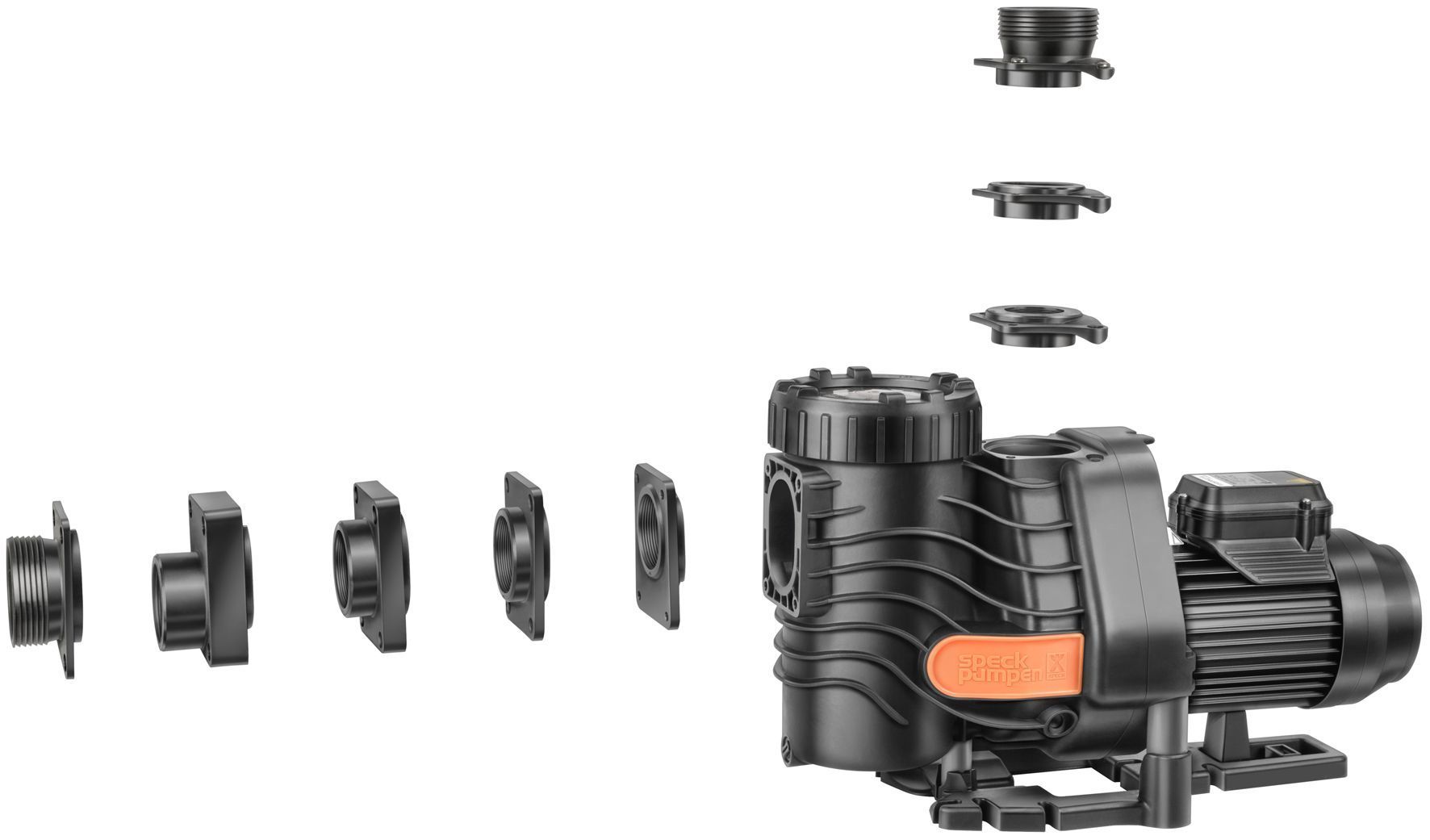 Durch optionale, flexible Anschlussvarianten herstellerunabhängig einsetzbare, selbstansaugende Filterumwälzpumpe BADU EasyFit 29 in Drehstromausführung, für Beckenvolumen von ca. 120 - 150 m³.