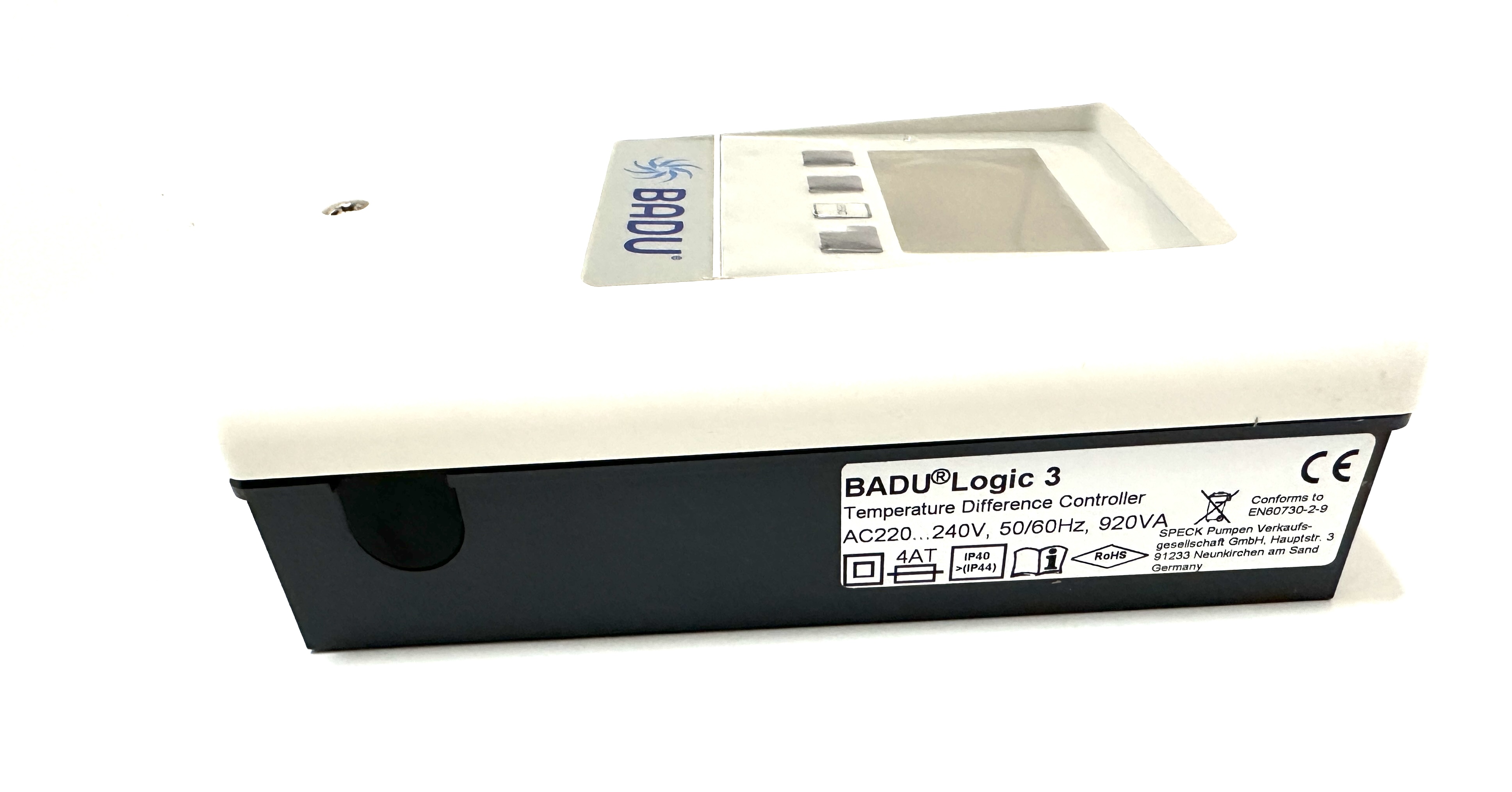 Pumpensteuerung BADU Logic 3 zur vollautomatischen, komfortablen Steuerung der Temperatur und Filterzeiten, als Basisregler für solare Schwimmbadheizung, mit zusätzlicher Filterpumpenansteuerung und Laufzeitoptimierung, mit zusätzlicher Filterpumpenansteuerung für mehrstufige BADU GREEN Motoren, wie z. B. BADU Eco Touch-Pro und BADU Eco 90 VS, inklusive zwei Temperaturfühler.