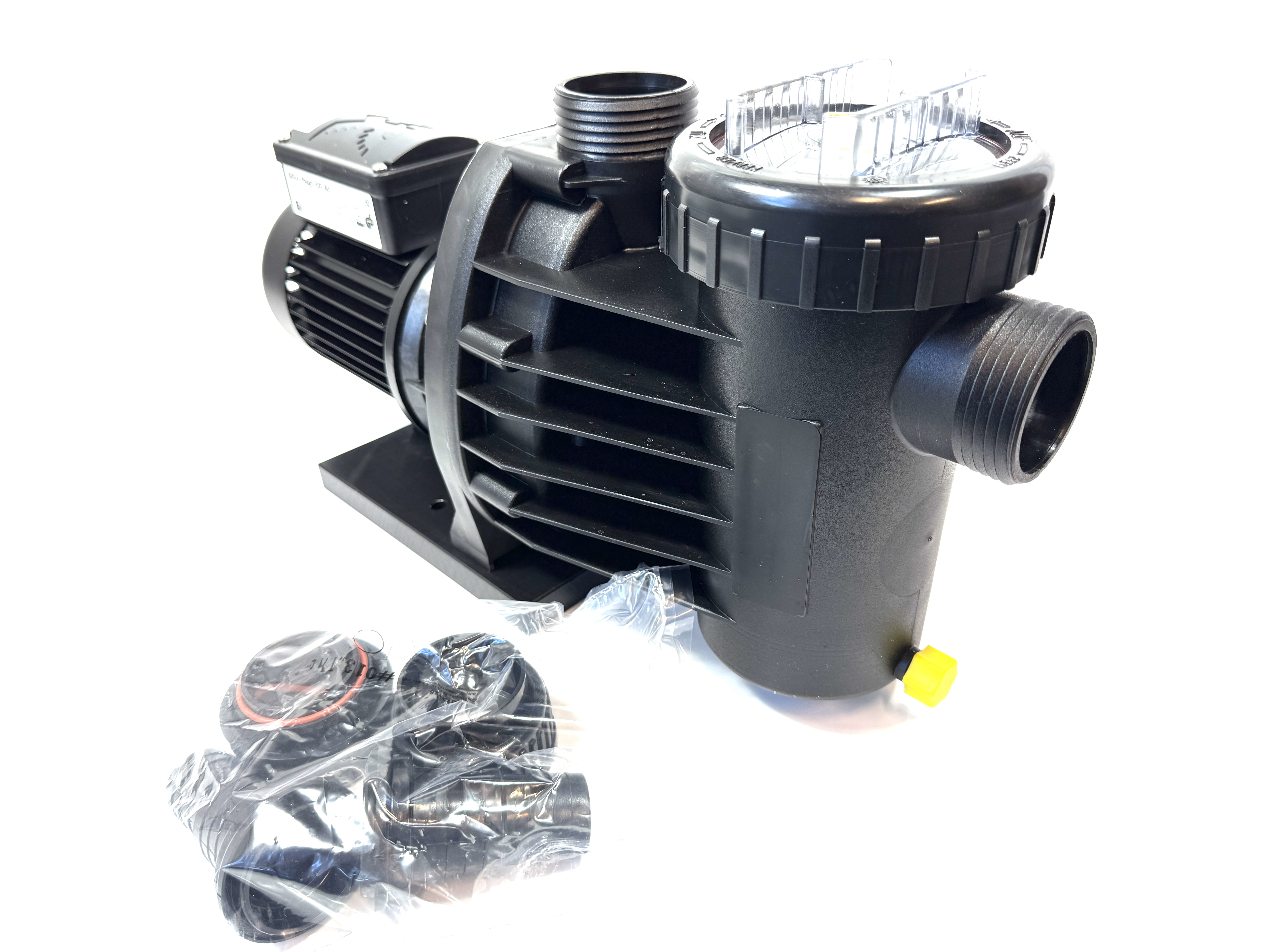 Blockpumpe mit integriertem Fasernfänger. Balg-Gleitringdichtung auf Kunststoff-Laufradnabe montiert. Motor- bzw. Pumpenwelle kommt mit dem Schwimmbadwasser nicht in Berührung! Elektrische Trennung. Die Pumpe entspricht der Standardvariante, jedoch ist durch eine Zwischenlaterne der Dichtungsraum nicht direkt am A-seitigen Motorlager angebaut, sondern zusätzlich mit einem Zwischenraum und einer Labyrinthscheibe vom Motor getrennt.