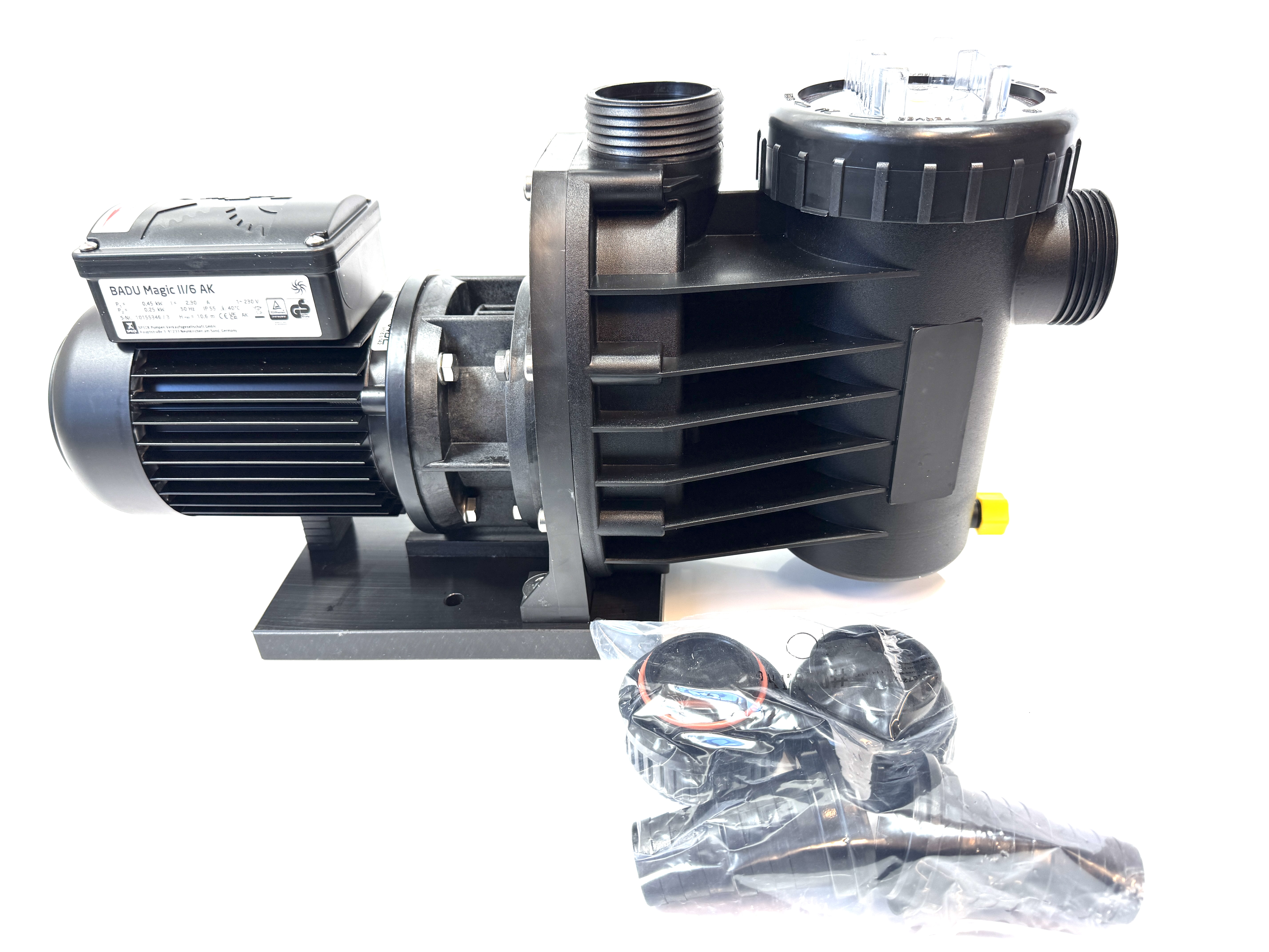 Selbstansaugende Filterumwälzpumpe BADU Magic II/11-AK, Wechselstrom, in Laternenausführung, NICHT MEHR LIEFERBAR - ERSETZT DURCH BADU ALPHA 12-AK, 2104120048 Gleitringdichtung SIC/SIC + VITON 1~ 230 V Hmax: ca. 12,7 m Qmax: ca. 18,1 m³/h techQ: ca. 11,2 m³/h techH: 8 m WS Motorleistung: P1=0.72 kW / P2=0.45 kW Saug/Druck(d): Spezialverschraubung mit Bundbuchse d=50 Beschreibung: Die BADU Magic AK-SSV Pumpen repräsentieren das Einstiegsprogramm der Speck-Pumpen Schwimmbad-Umwälzpumpen von 4 bis 11 m³/h für kleine bis mittlere Filteranlagen. Hochwertige und bewährte selbstansaugende Filterumwälzpumpe in AK-Ausführung, für Salzwasser, Meerwasser und Sole, mit Zwischenlaterne, aufstellbar oberhalb oder unterhalb des Wasserniveaus jeweils max. 3 m. Die "AK"-Ausführung der BADU Pumpe entspricht der Standardvariante, jedoch ist durch eine Zwischenlaterne der Dichtungsraum nicht direkt am A-seitigen Motorlager angebaut, sondern zusätzlich mit einem Zwischenraum und einer Labyrinthscheibe vom Motor getrennt. Eventuell austretendes Medium und auskristallisierende Mineralien oder Salze kommen somit nicht mit dem Motor und dem Lager in Verbindung. Hierdurch wird eine erheblich längere Betriebszeit gegenüber Standardpumpen für diese Einsatzgebiete ermöglicht. Einsatzgebiet:Schwimmbadwasser-Umwälzung in Filteranlagen, aufstellbar jeweils max. 2 m oberhalb oder 3 m unterhalb des Wasserniveaus. Thermalwässer, Thermalsole, Seewasseraquarien mit künstlich aufbereitetem Salzwasser, Pökelanlagen, und diverse Problemmedien nach Überprüfung der Bestandteile und Konzentration.Grundsätzlich ist bei Bestellung immer das Medium genau anzugeben, damit die Beständigkeit der Pumpen geprüft werden kann. Ausführung:Blockpumpe mit integriertem Fasernfänger. Balg-Gleitringdichtung auf Kunststoff-Laufradnabe montiert. Motor- bzw. Pumpenwelle kommt mit dem Schwimmbadwasser nicht in Berührung! Elektrische Trennung. Die Pumpe entspricht der Standardvariante, jedoch ist durch eine Zwischenlaterne der Dichtungsraum nicht direkt am A-seitigen Motorlager angebaut, sondern zusätzlich mit einem Zwischenraum und einer Labyrinthscheibe vom Motor getrennt.Eventuell austretendes Medium und auskristallisierende Mineralien oder Salze kommen somit nicht mit dem Motor und dem Lager in Verbindung. Hierdurch wird eine erheblich längere Betriebszeit gegenüber Standardpumpen für diese Einsatzgebiete gewährleistet.