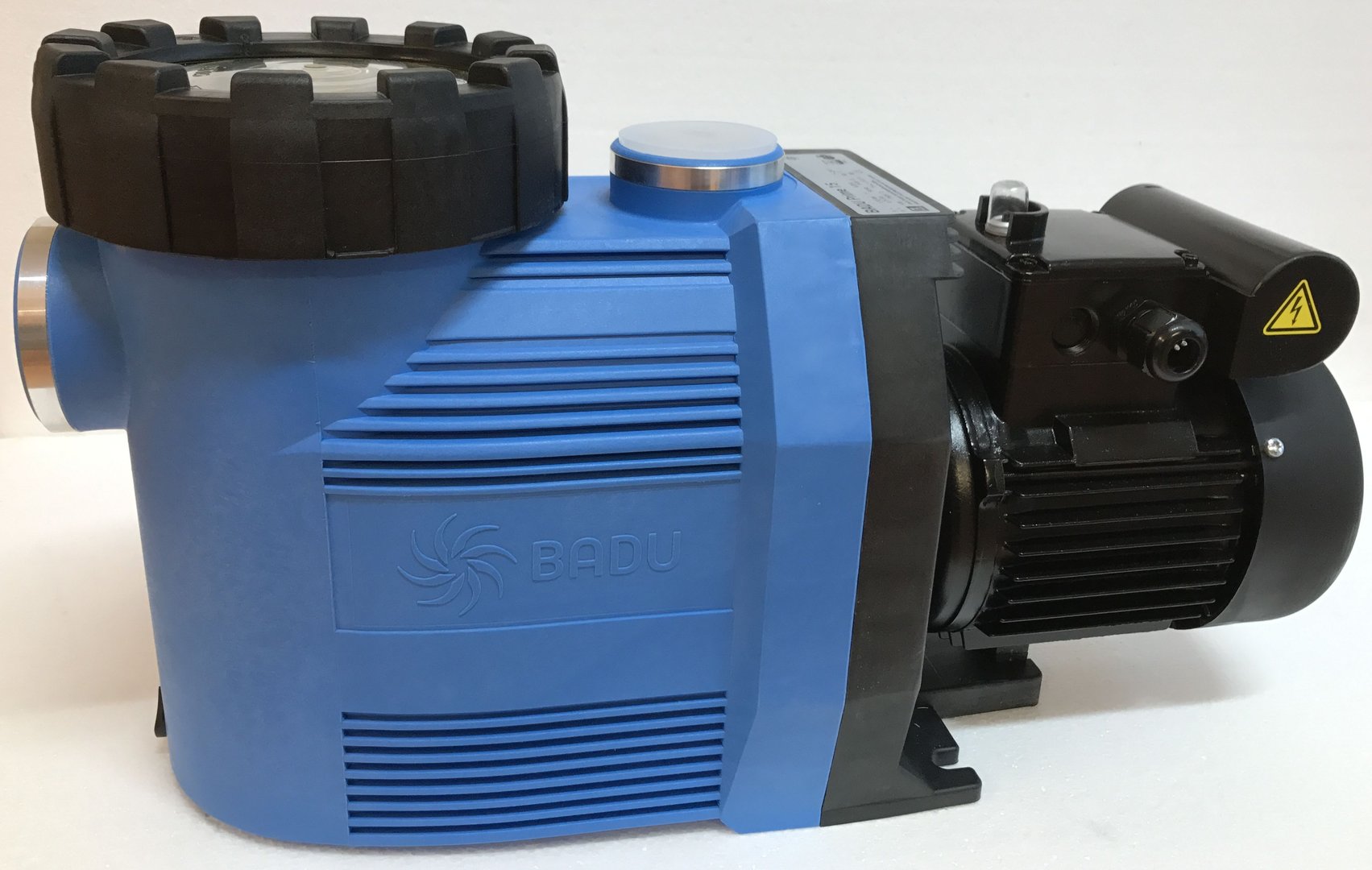 Die Kunststoffpumpen der Baureihe BADU Prime 11 Dr. in Drehstromausführung sind zur Umwälzung des Schwimmbadwassers in Kombination mit einer entsprechenden Filteranlage konzipiert. Die medienberührten Kunststoffteile sind überwiegend aus glas - faserverstärktem Polypropylen PP GF 30 hergestellt und haben damit eine hervorragende Korrosionsbeständigkeit gegenüber dem Schwimmbadwasser und den zur Wasserpflege üblichen Wasserbehandlungsmitteln. Im Pumpengehäuse sind keine Inserts enthalten. Damit ist dieses recyclingfähig. Die Motorwelle dient gleichzeitig als Pumpenwelle, auf der das Laufrad be - festigt ist. Als Wellendichtung dient eine Balg-Gleitringdichtung, die auf der Laufradnabe aus Kunststoff sitzt. Hierdurch ist eine sichere Trennung zwischen Schwimmbadwasser und Elektromotor gegeben. Durch die Blockbauweise haben die Pumpen einen geringen Platzbedarf. Sie werden durch Drehstrommotoren oder Wechselstrommotoren angetrieben. Im Pumpengehäuse ist ein Saugsieb (143) integriert, das gröbere Verunreinigungen aus dem Pumpeninneren fernhält.