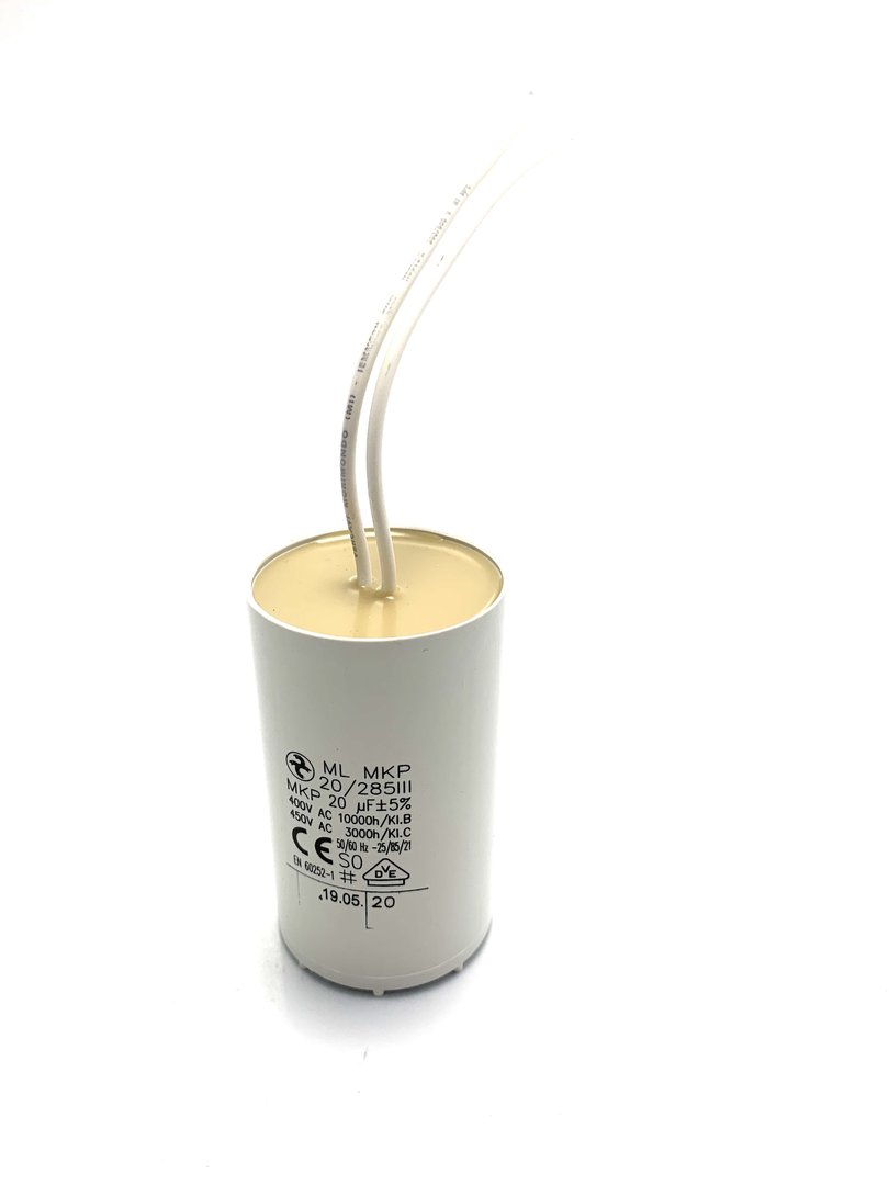 Kondensator ohne Bolzen, 20 µF +/- 5%, S0, 50-60 Hz, Litzenlänge 150 mm, für Super Pump 14 (ab ca. 01/17), Bettar 14 (ab ca. 01/17), BADU Top 14 (ab ca. 01/17), BADU Top II/14 (ab ca. 01/17), als Ersatz für defekte Motorkondensatoren