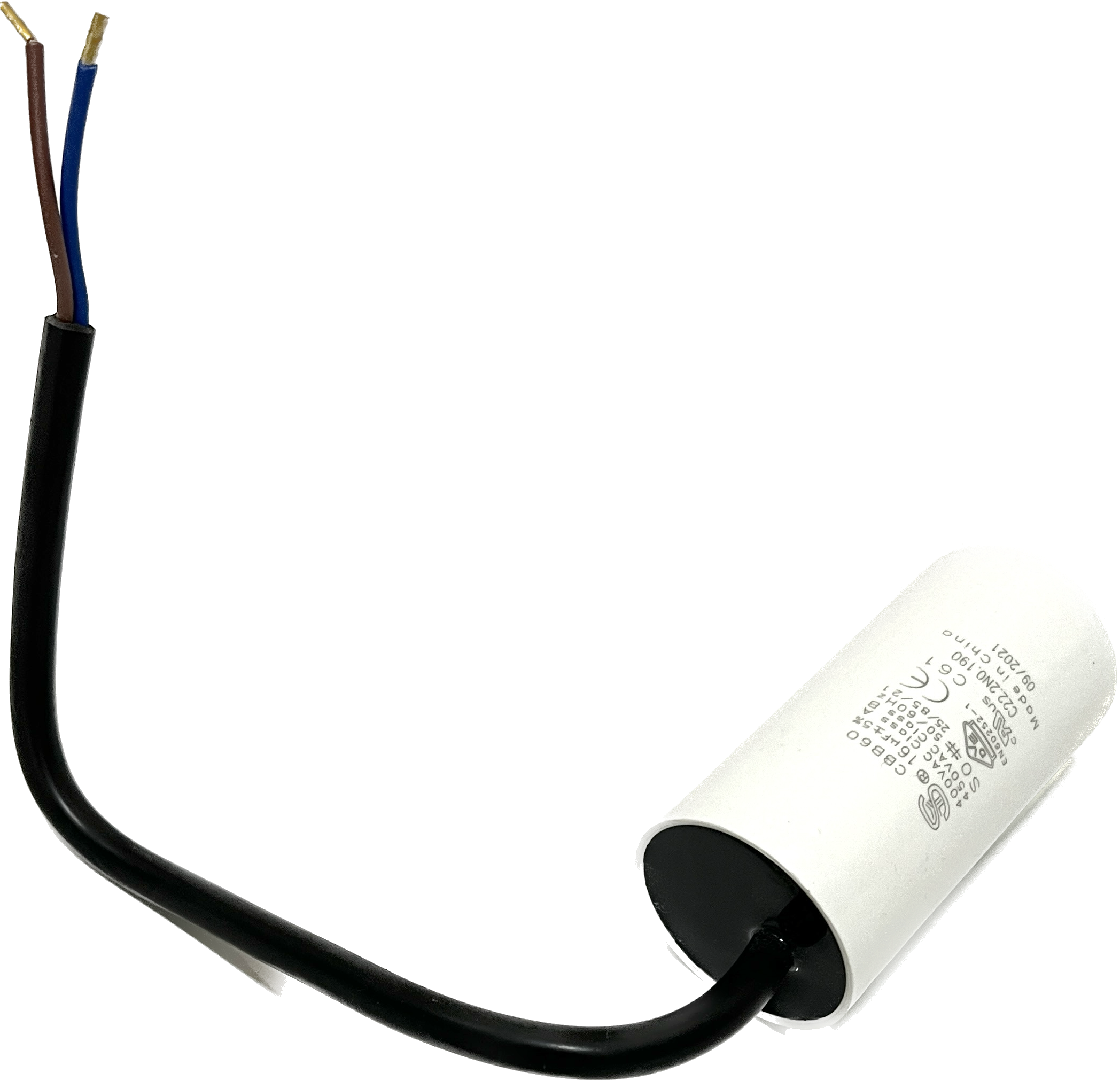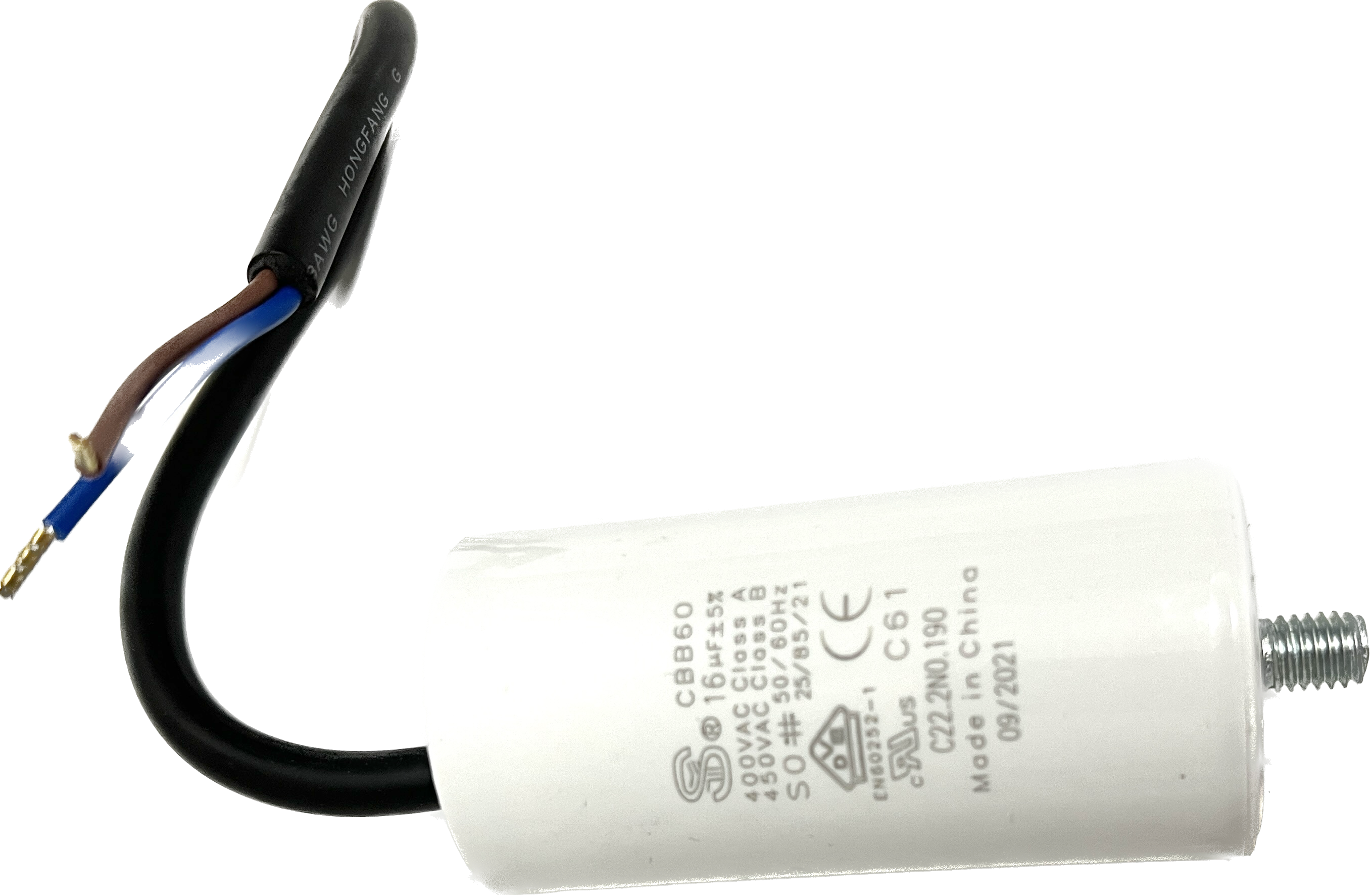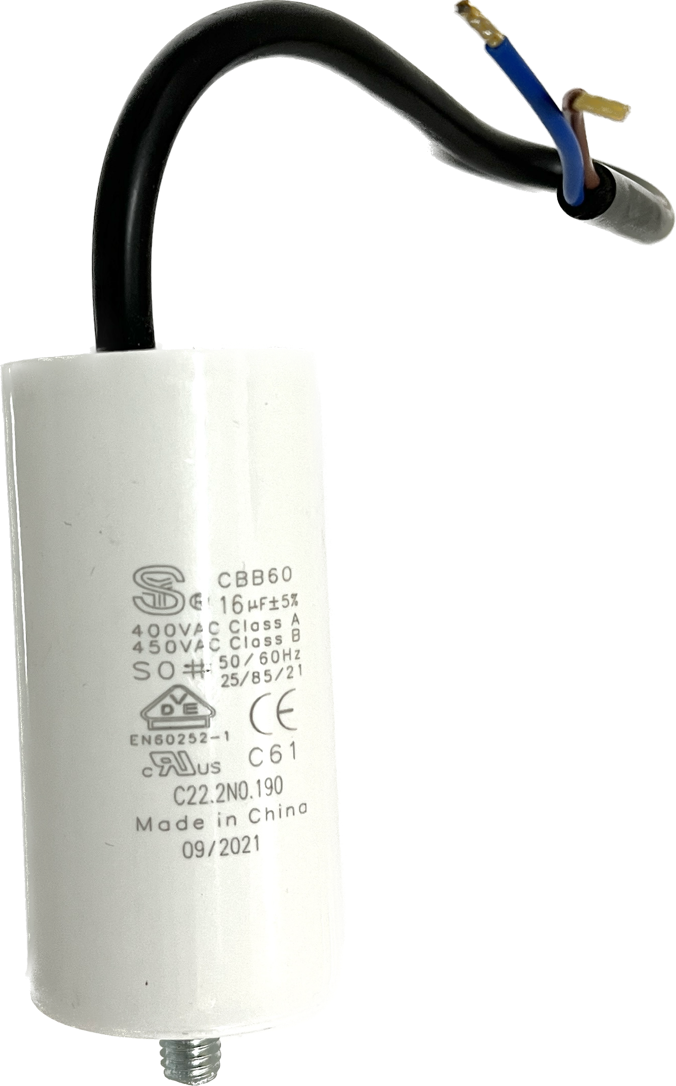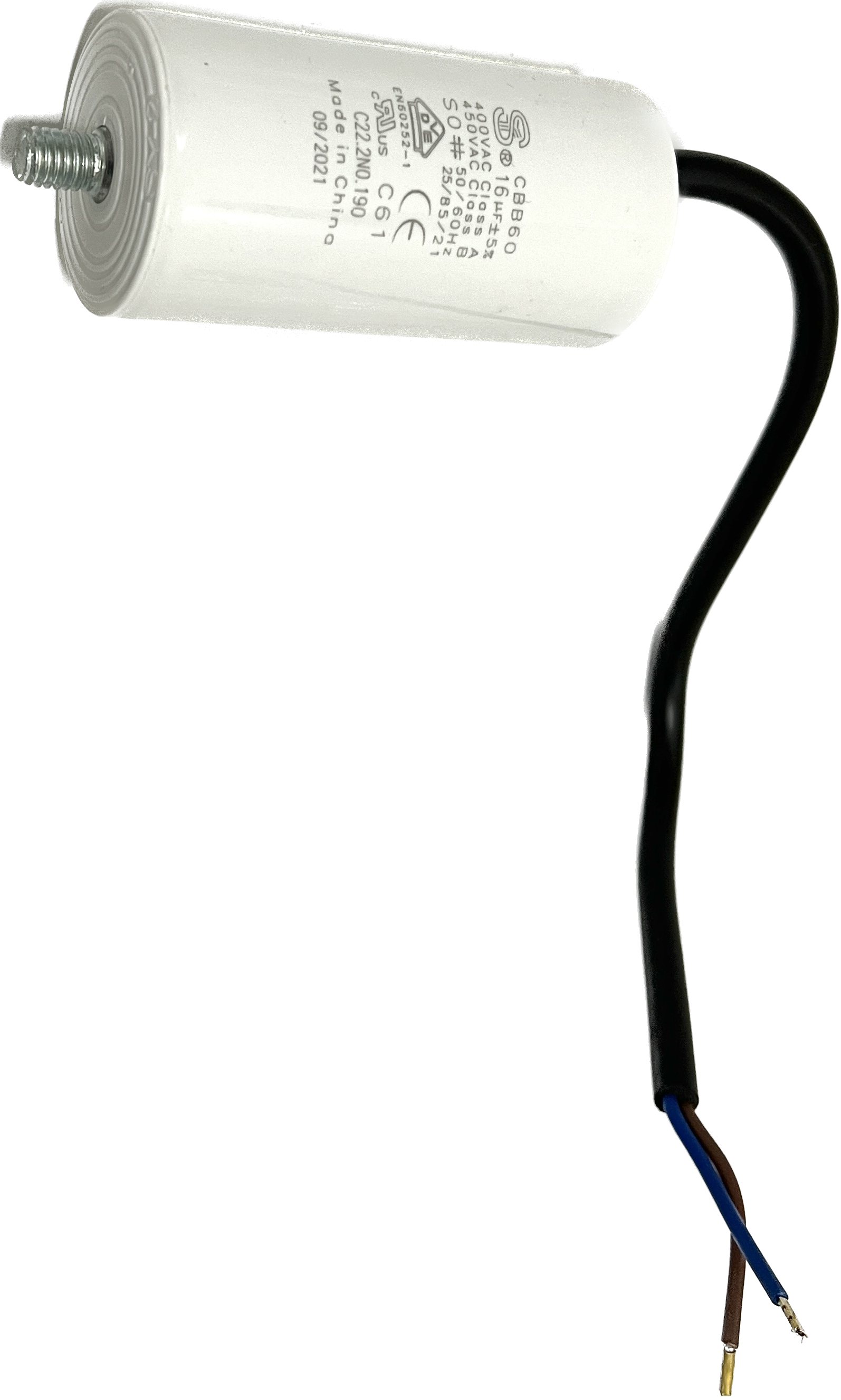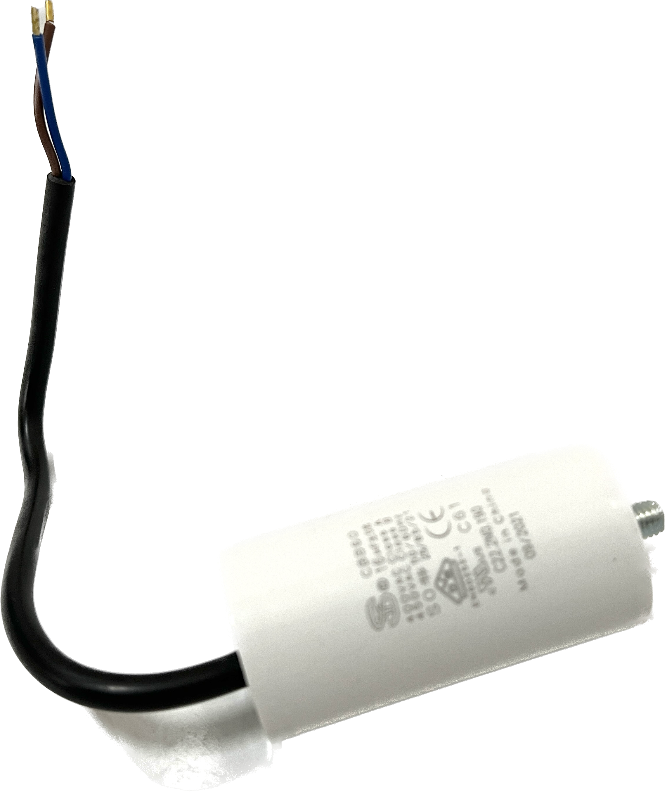 Kondensator mit Bolzen, 16 µF +/- 5%, S0, 50-60 Hz, 40 x 80 mm, M8 Bolzen, Kabellänge 250 mm, 40 mm davon abgemantelt mit Aderendhülsen, alternativ für Kondensatorrohre mit Schraubgewinde geeignet, für BADU Top 14, Bettar 14, Super Pump 14 (bis ca. 12/16), BADU Magic 8, BADU Magic 11, Bettar 12, BADU Top 12, Super Pump 12, BADU 90/13, BADU Bronze 14, BADU 40/6 (ab 1/95 für 0,3 kW), BADU 40/7 (ab 1/95 für 0,3 kW), BADU 42/6 (ab 1/95 für 0,3 kW), BADU 90/7 (ab 1/95 für 0,3 kW), BADU Star 69 (ab 1/95 für 0,3 kW), BADU Bronze 7 (ab 1/95 für 0,3 kW), BADU 40/9 (ab 1/95), BADU 40/11 (ab 1/95), BADU 42/9 (ab 1/95), BADU Bronze 11 (ab 1/95), BADU 90/11 (ab 1/95), BADU Star 913 (ab 1/95), als Ersatz für defekte Motorkondensatoren