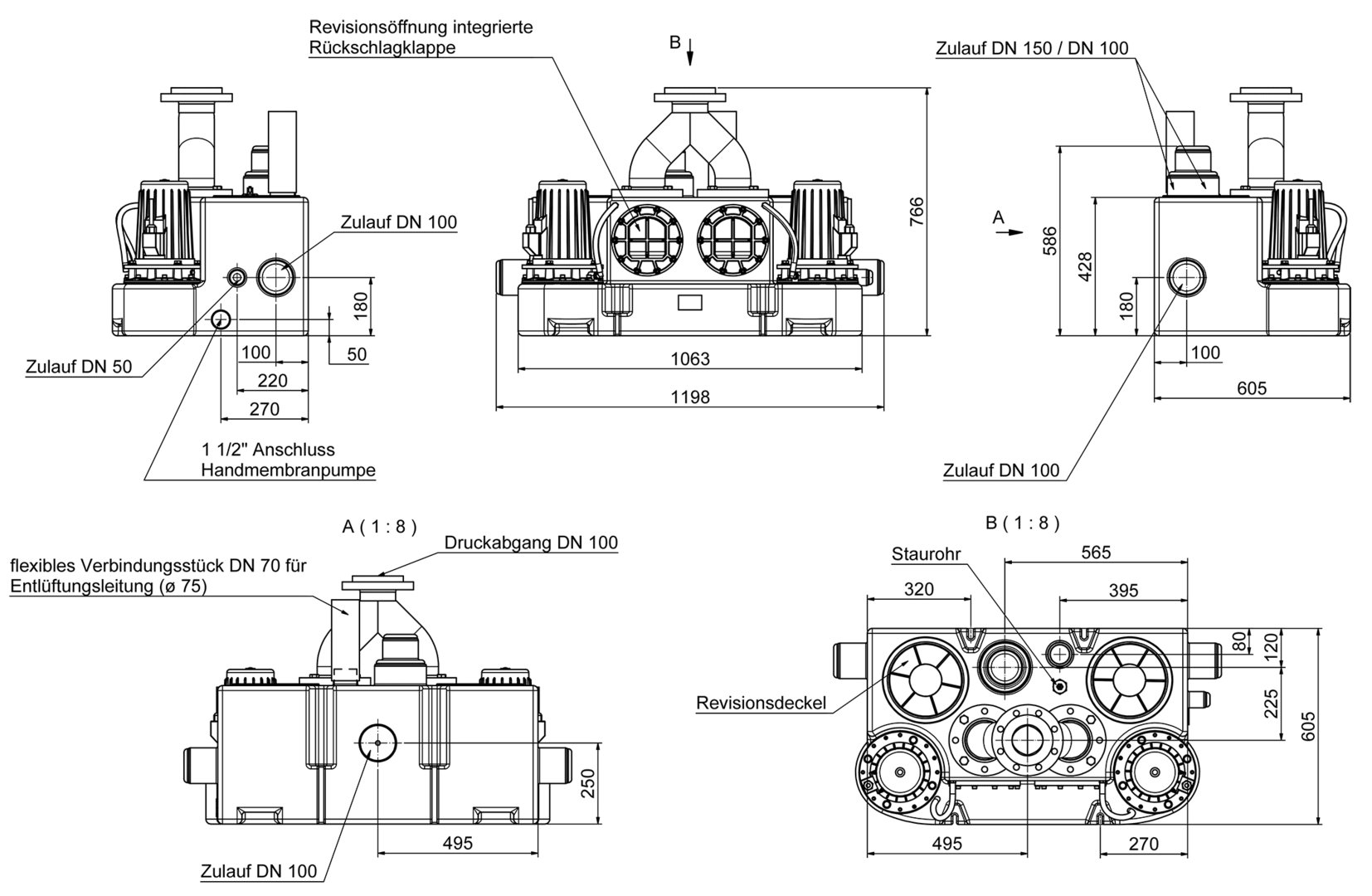 - inlets: 2 x lateral DN 100, 1 x lateral DN 50, 1 x back DN 100 and 1 x top DN 50/100