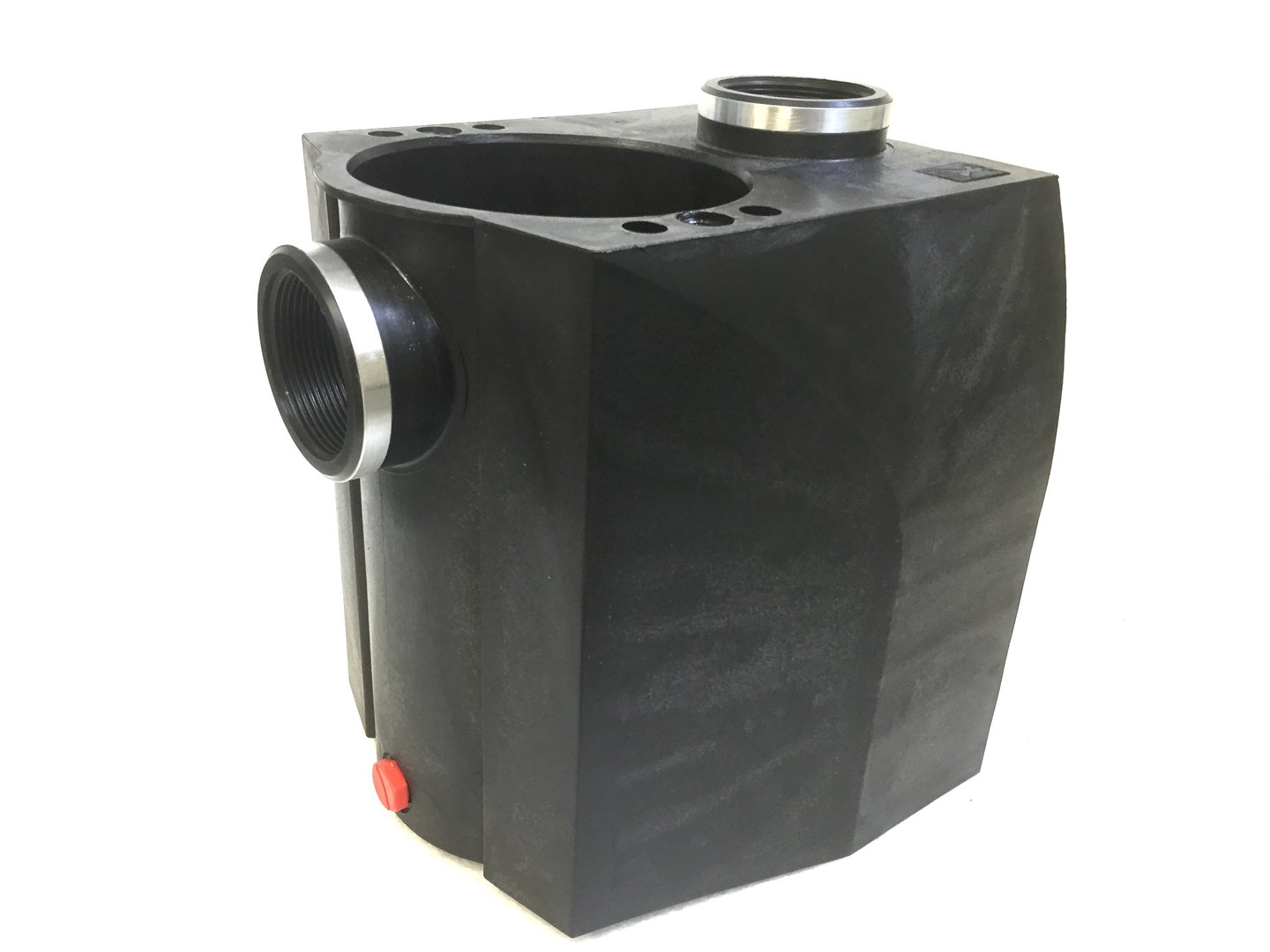 Gehäuse, komplett, Rp 1 1/2 x 1 1/2, schwarz, für BADU E 40/69, BADU E 40/70, BADU E 40/109 und BADU E 40/110, bestehend aus Gehäuse, Saugsieb, Deckel mit O-Ring und Knebeln, Verschlussschraube mit O-Ring, Pos. 101